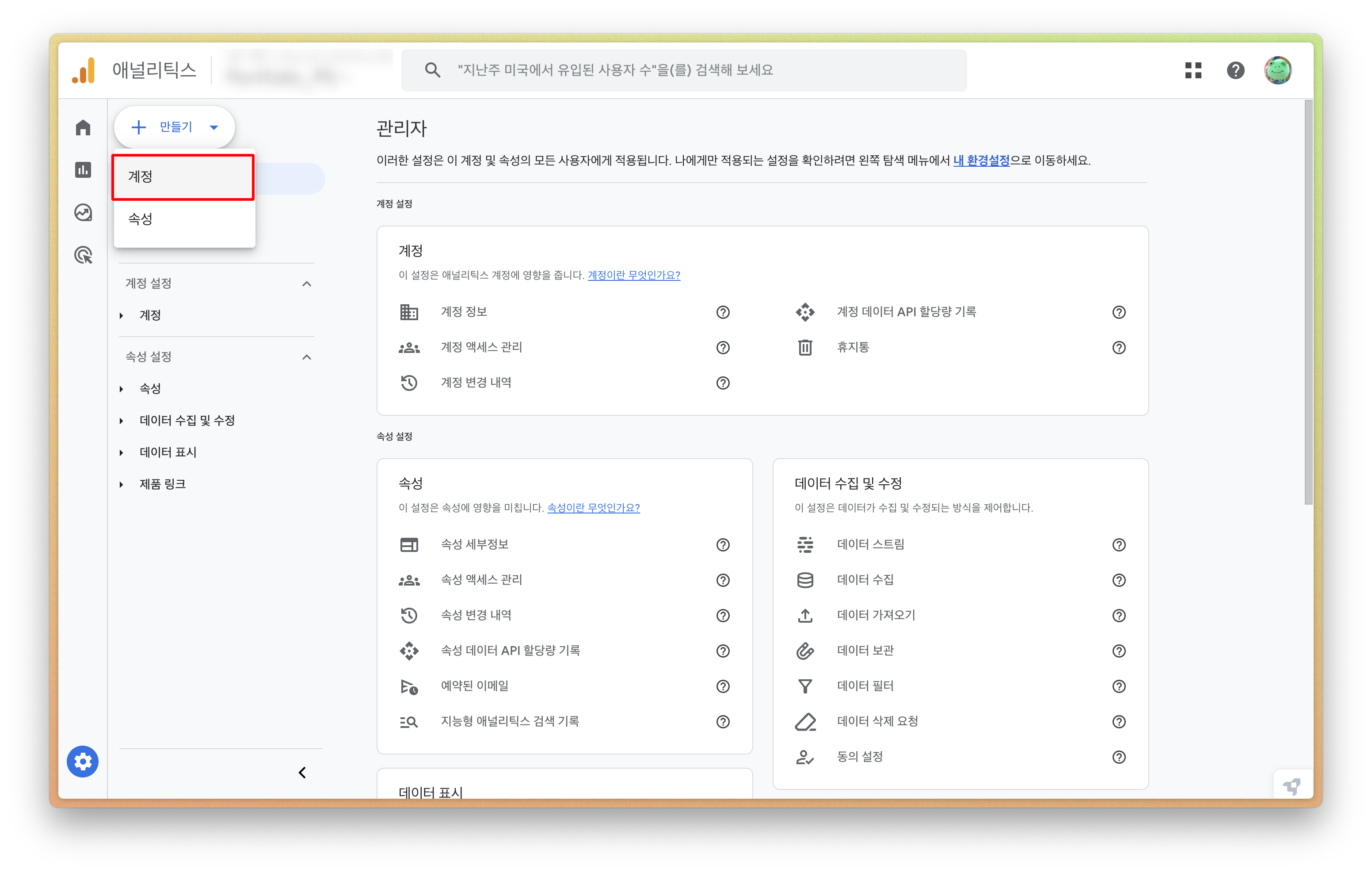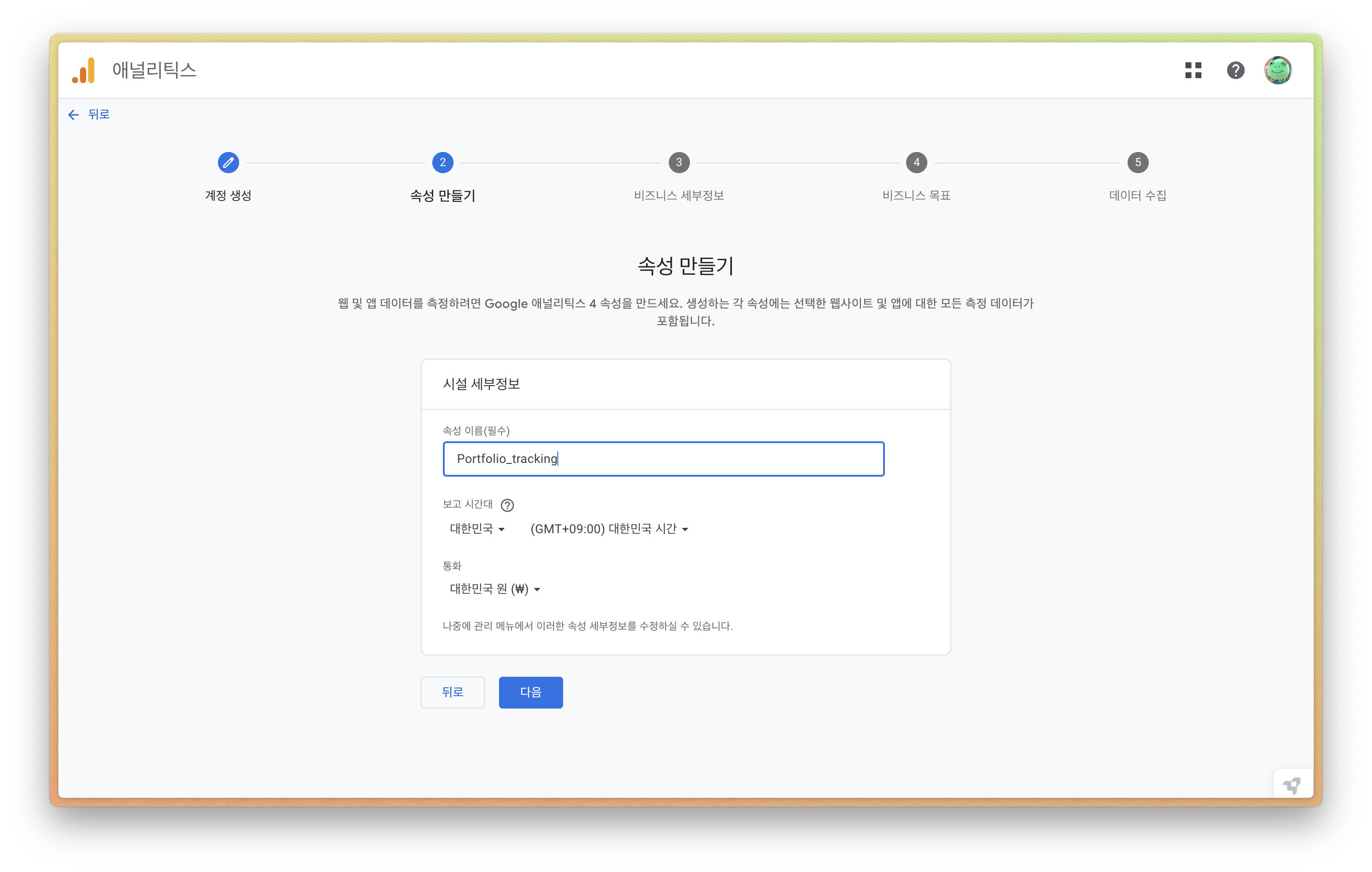 3. 속성 만들기 > 이름을 적어줍니다. 시간대와 통화도 대한민국 기준으로 설정해 주세요.