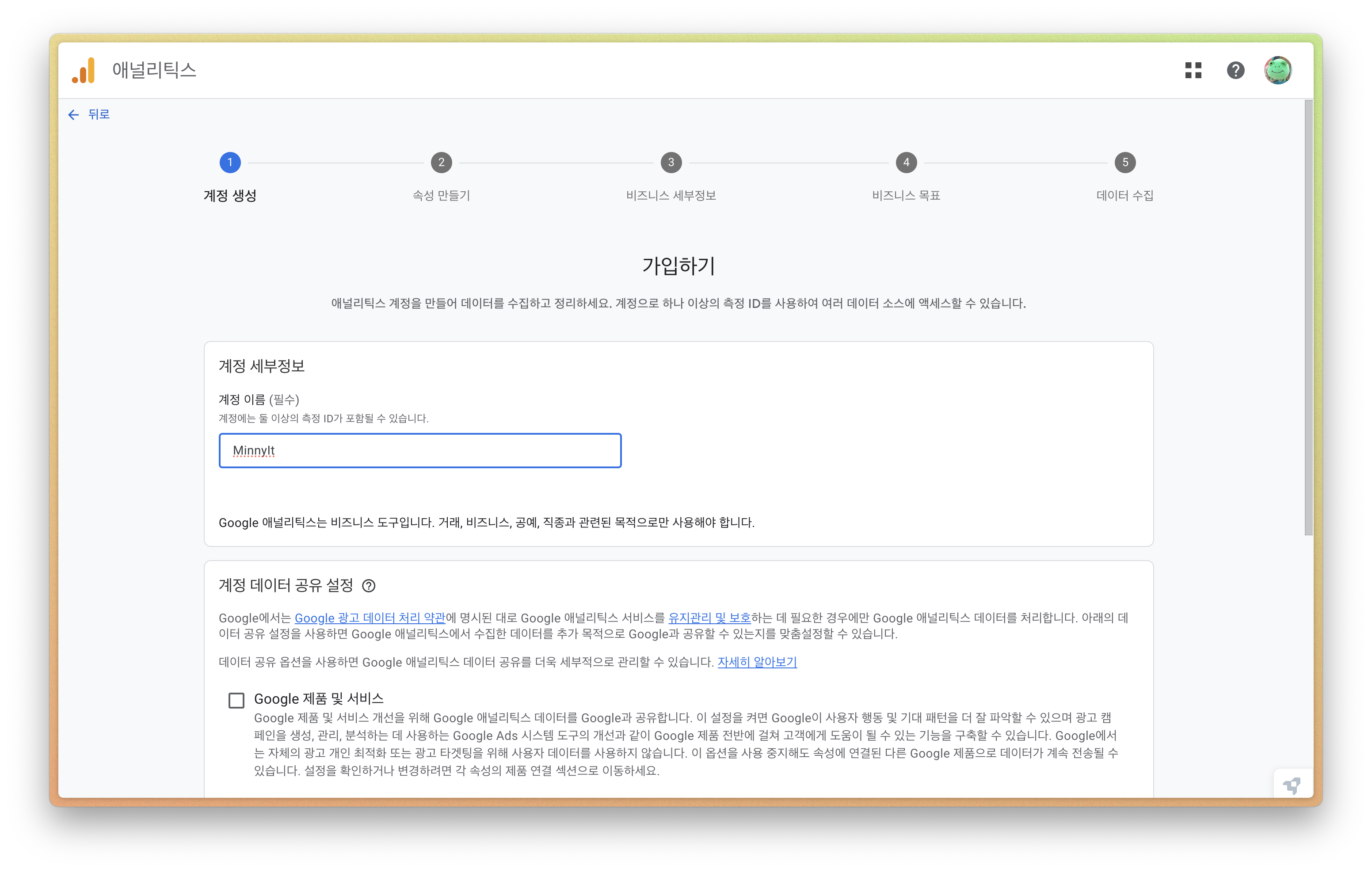 2. 계정 이름을 적어주시고, 아래 계정 데이터 공유 설정은 그대로 유지합니다.