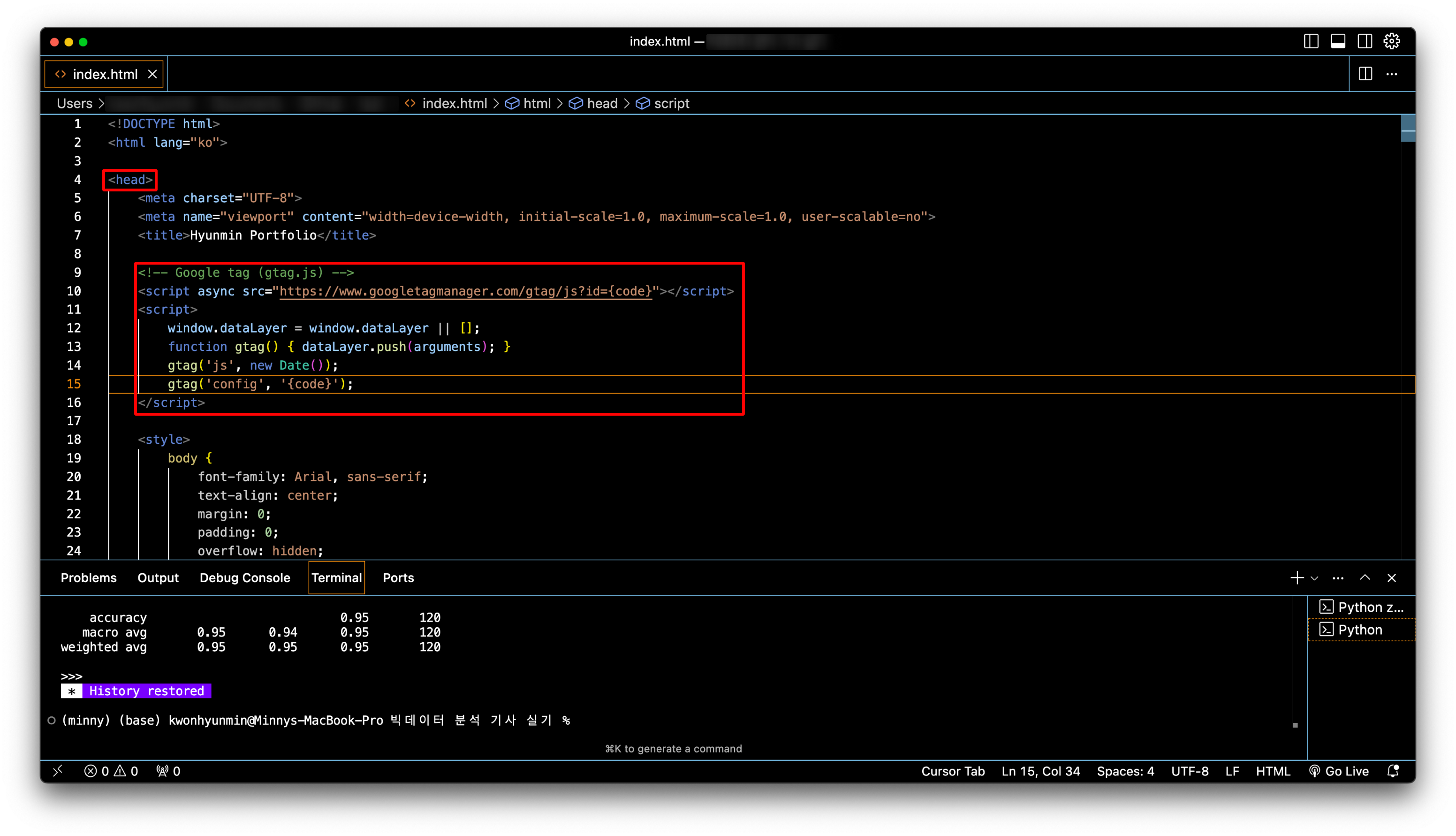 10. Cursor로 돌아와 해당 코드를 index.html의 head 태그 안에 붙여 넣어 줍니다.