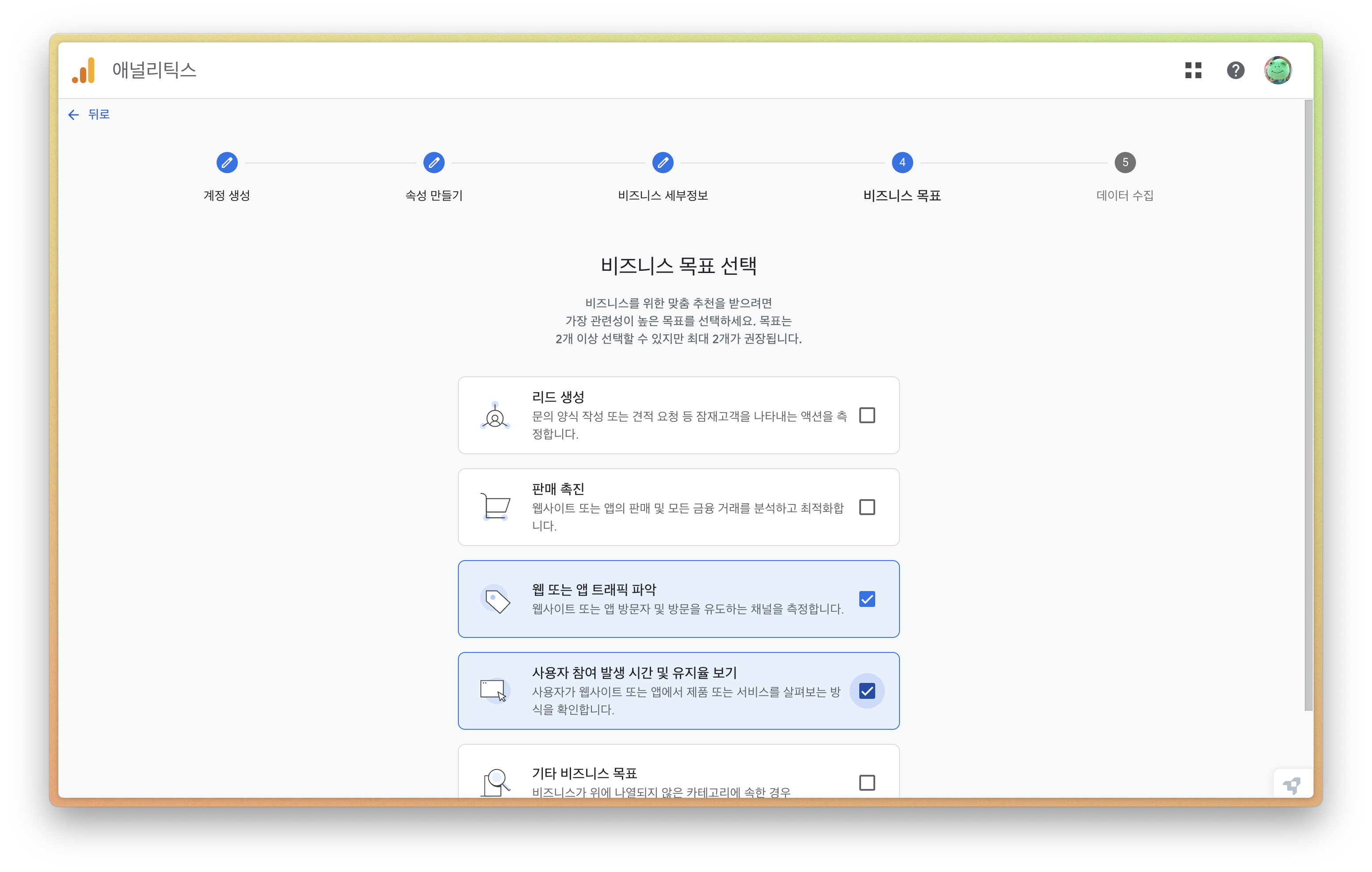 5. 비즈니스 목표를 선택해 주세요. 저는 웹 또는 앱 트래픽 파악, 사용자 참여 발생 시간 및 유지율 보기를 선택했습니다.